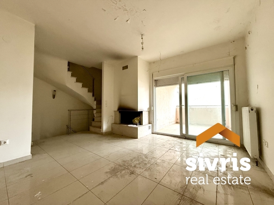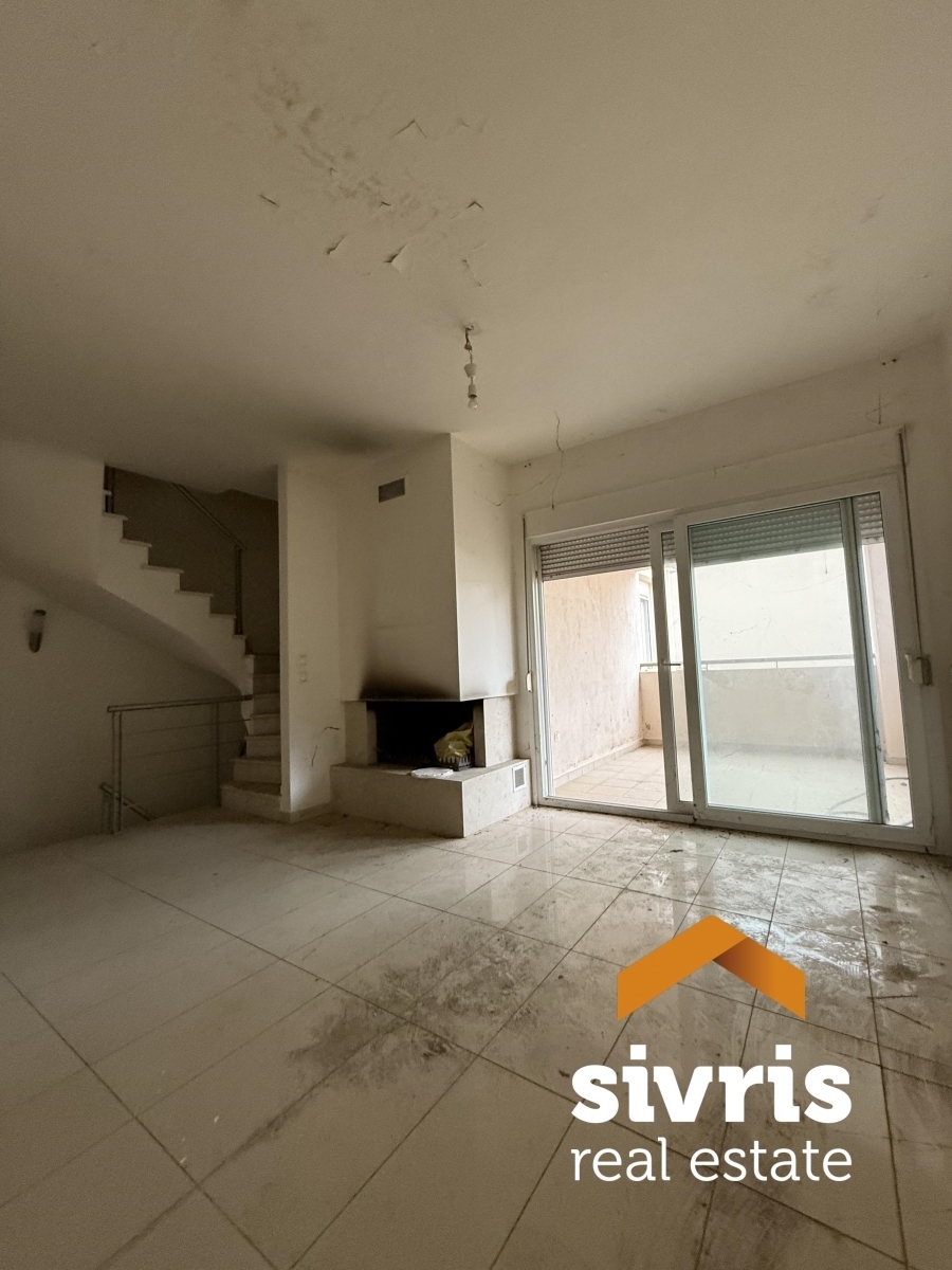 Πρόκειται για μεζονέτα εσωτερική σε συγκρότημα κατοικιών. Οργανώνεται σε τρία επίπεδα, με το μεσαίο όροφο (55τμ) να διαθέτει μεγάλο φωτεινό σαλόνι με τζάκι, κουζίνα (σε πολύ καλή κατάσταση) και WC. Επιπλέον μεγάλη βεράντα.