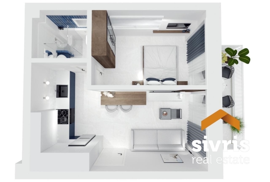 Πρόκειται για διαμέρισμα 50τμ που αποτελείται από ένα υπνοδωμάτιο με ντουλάπα, σαλόνι-κουζίνα, μπάνιο με μπανιέρα και μια άνετη βεράντα με ανοιχτωσιά.